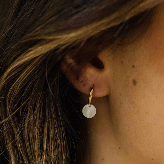 Hoops Oorbellen met bungelende munten in band | Parelmoer | 14k goud